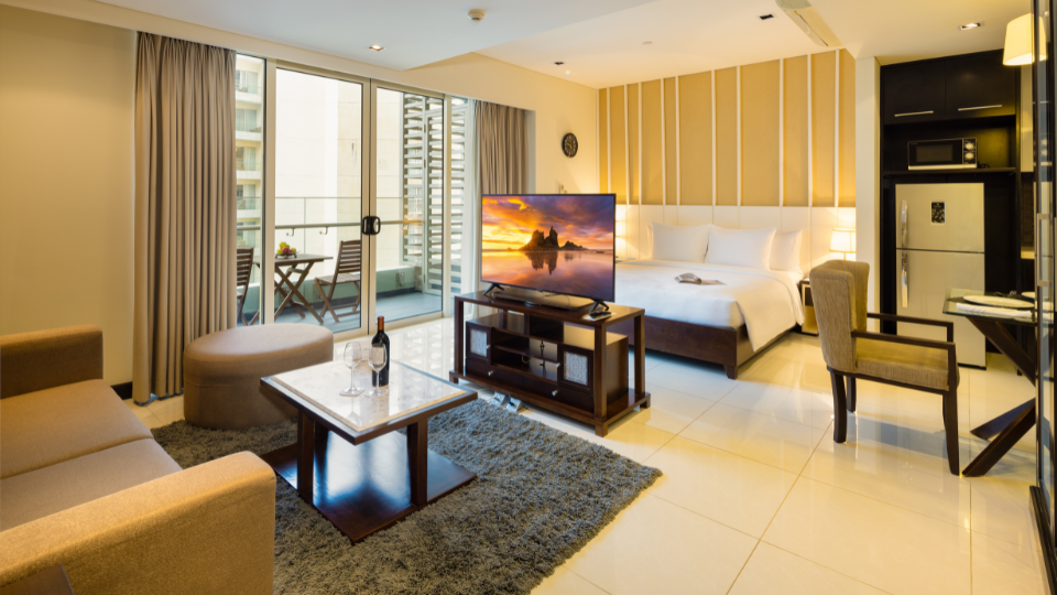Căn hộ Studio Ocean View tại The Costa – không gian mở, nội thất hiện đại, ban công hướng biển, lý tưởng cho cặp đôi hoặc khách du lịch cá nhân.