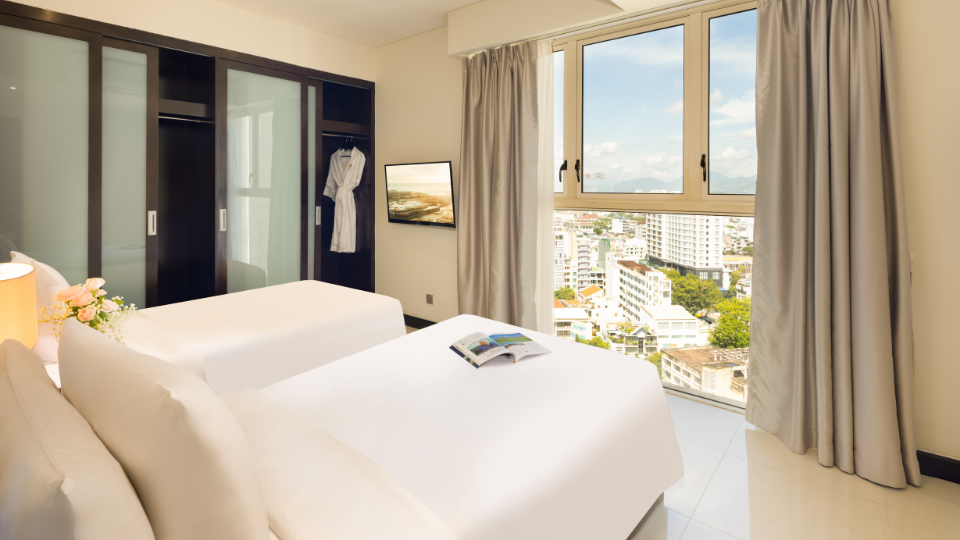A perfect solution for a larger family vacation or a long-term stay in Nha Trang. Spacious 3-bedroom suite with stunning views, full kitchen, and modern amenities.